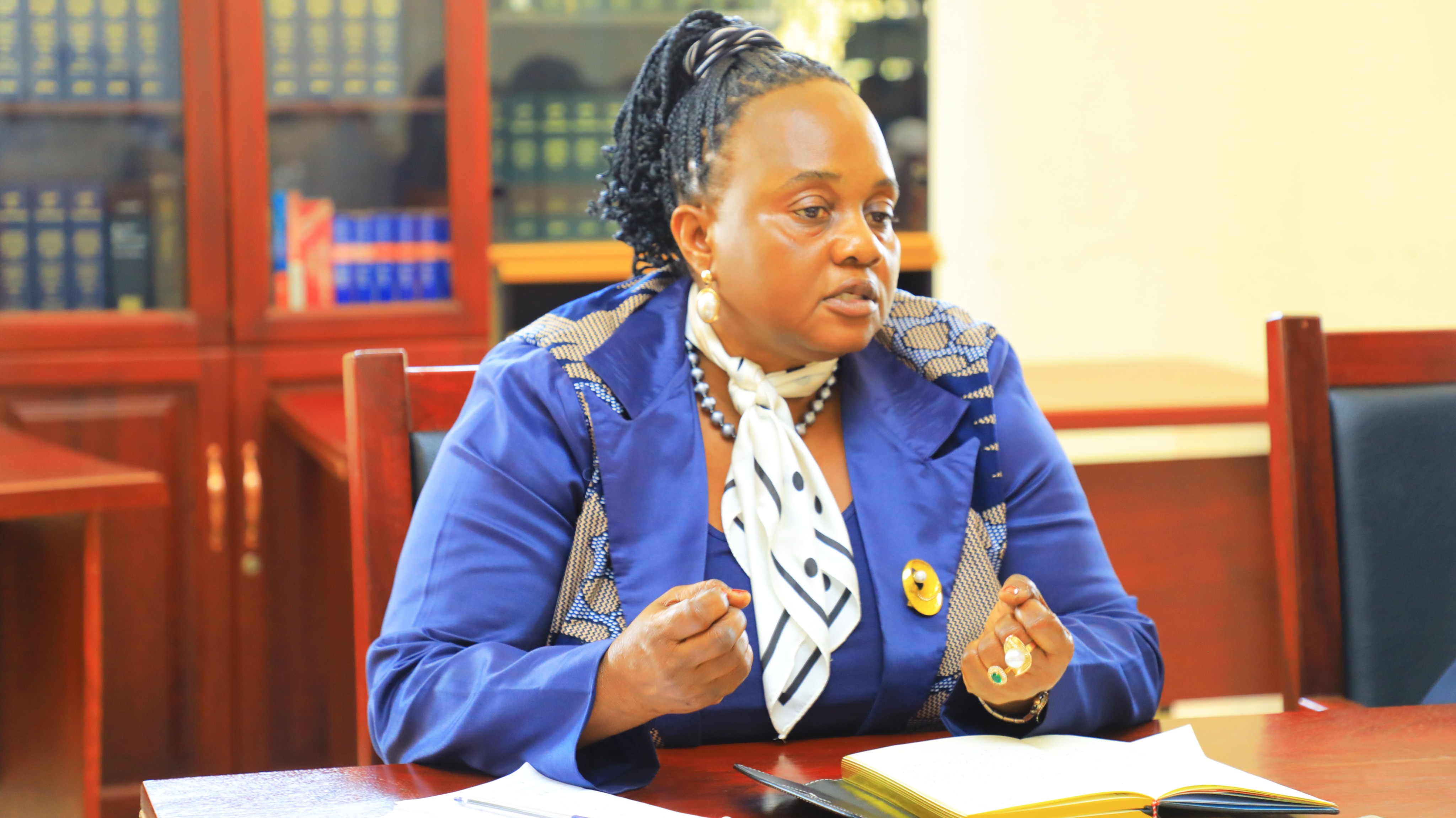 Mwenyekiti wa Tume ya Kurekebisha Sheria Tanzania, Mhe. Jaji Winfrida Korosso akimkabidhi taarifa ya Tume hiyo Waziri wa Katiba na Sheria Mhe. Dkt. Juma Zuberi Homera,alipotembelea ofisi za Tume hiyo zilizopo chuo kikuu cha Dododoma tarehe 26 Novemba 2025, Mwingine aliesimama pembeni ya Mwenyekiti ni Katibu Mtendaji wa Tume hiyo Bw. George Mandepo.